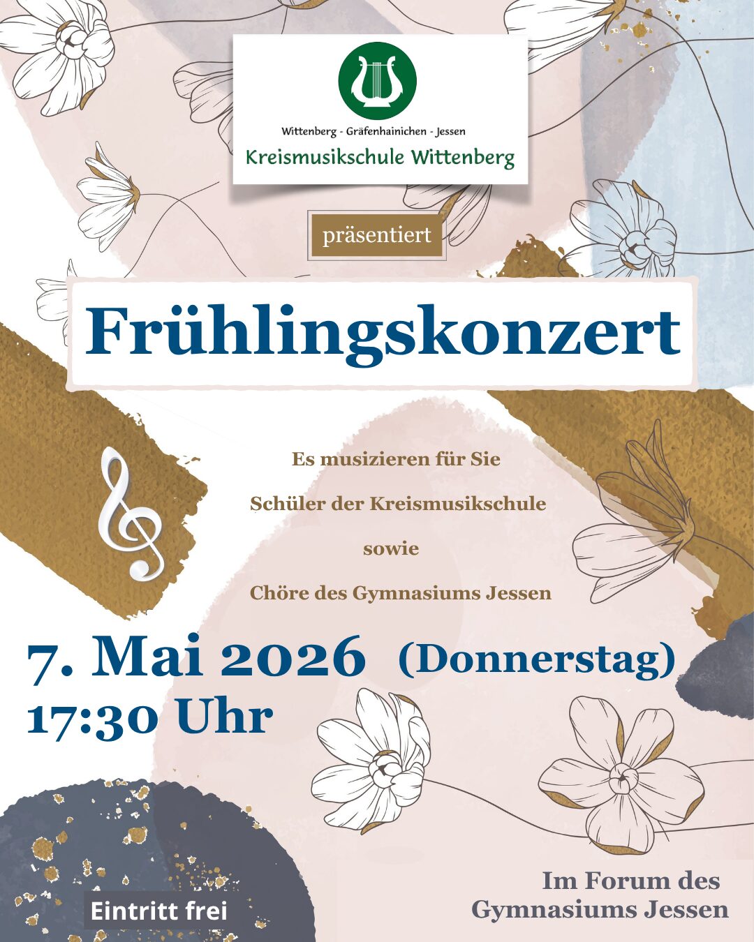 Am Donnerstag, dem 7. Mai 2026, lädt die Kreismusikschule Wittenberg herzlich zu einem stimmungsvollen Frühlingskonzert in das Gymnasium Jessen ein. Beginn der Veranstaltung ist um 17:30 Uhr.